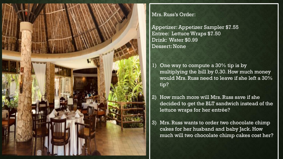 One way to compute a 30% tip is by multiplying the bill by 0.30. How much money would Mrs. Russ need to leave if she left a 30% tip?
