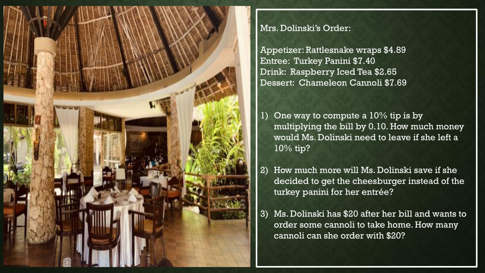 One way to compute a 10% tip is by multiplying the bill by 0.10. How much money would Ms. Dolinski need to leave if she left a 10% tip?