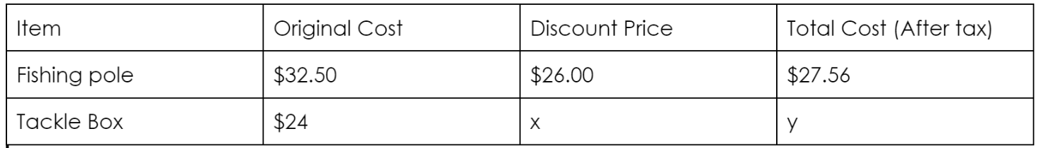 What is the total cost of the tackle box (y)?_______ (Round to the nearest penny)