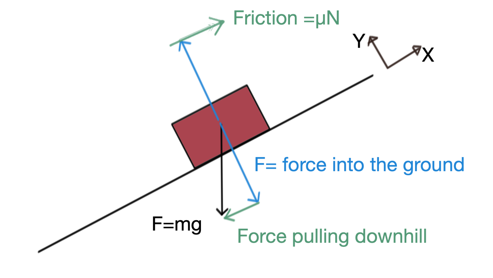 To make sense of the forces in 2d of a block sliding down an incline, we have to think about how to decompose vectors. every vector can be broken into a sum of other vectors, just like any number can be broken into an addition problem. The most convinient way to do this is to break a vector into x and y components.