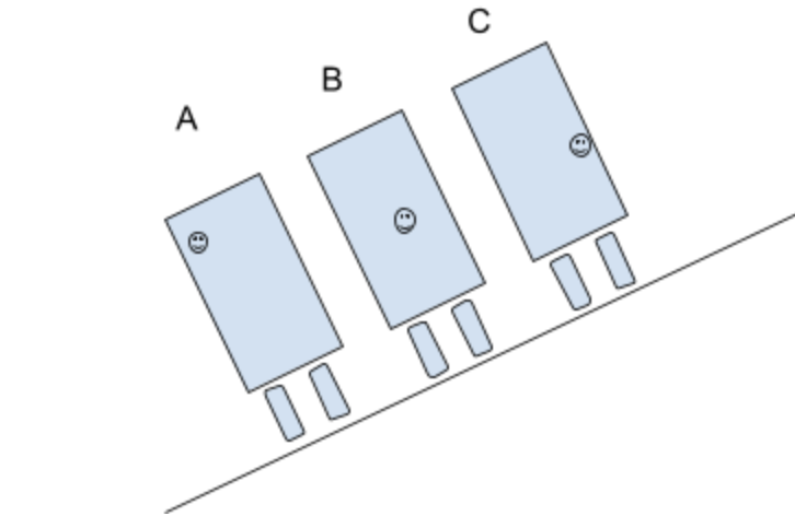 Three trucks have equal mass and are parked along an incline. while the mass is equal, they are arranged differently and have different center of mass, as shown by the smily face. Will any of the trucks tip over? Explain why (this is more of a gut feeling question than anything else, you can read in the book to explain though.)