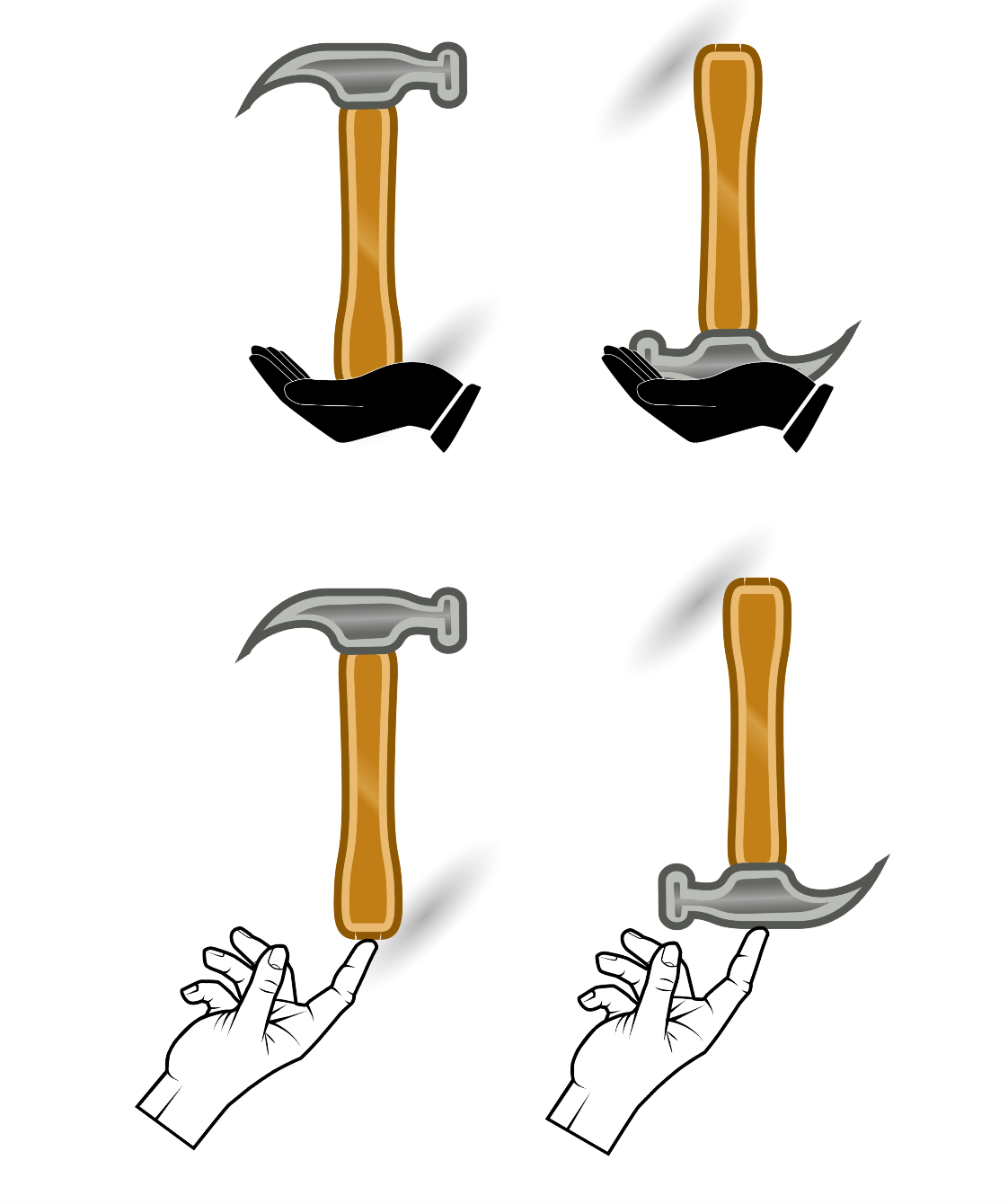 Predictions: if you were to attempt to balance a hammer (upright on the palm of your hand, upside-down on the palm of your hand, upright on the tip of your finger, upside-down on the tip of your finger, which way would you guess will be easier, which would be hardest?