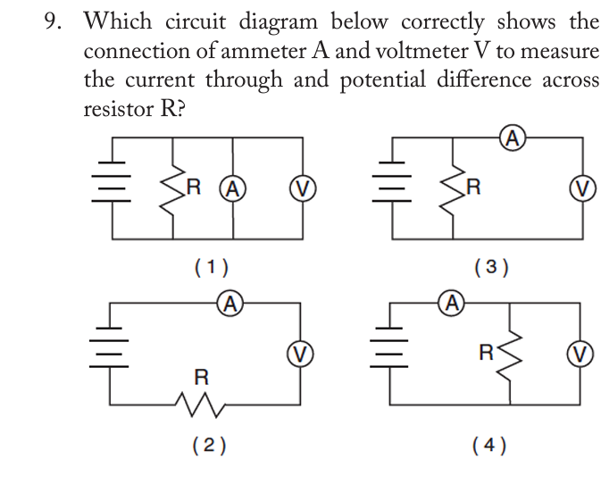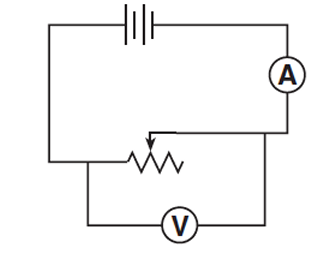 The diagram below represents a simple circuit consisting of a variable resistor (simply a resistor with a knob that you can use to increase or decrease the resistance of the resistor), a battery, an ammeter, and a voltmeter.