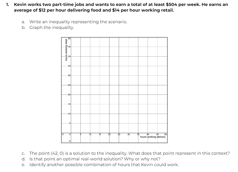 Kevin works two part-time jobs and wants to earn a total of at least $504 per week. He earns an average of $12 per hour delivering food and $14 per hour working retail.