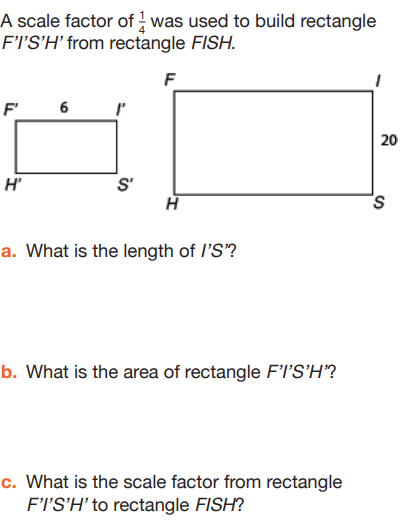 The length of I'S' is _______ units. The area of rectangle F'I'S'H' is _______ square units. The scale factor from rectangle F'I'S'H' to rectangle FISH is _______.