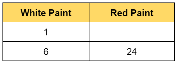 A certain shade of pink is created by adding 24 cups of red paint to 6 cups of white paint.