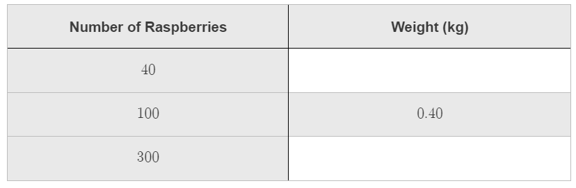 The table shows the weight of 100 raspberries at a market. There is a proportional relationship between the number of raspberries and their weight. How much does 300 raspberries weigh?