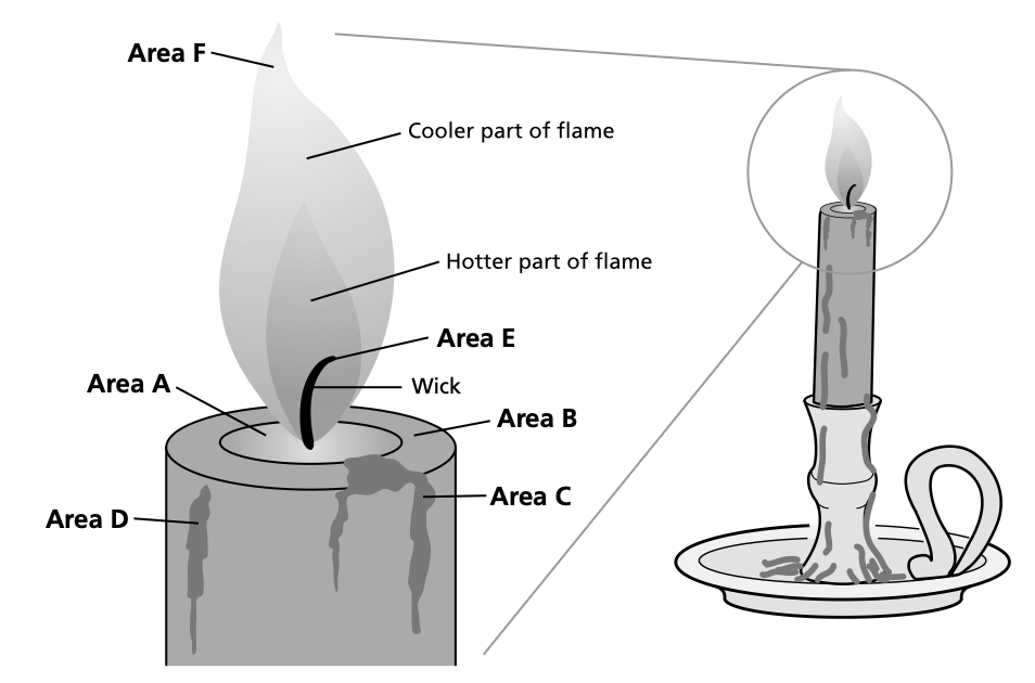 As students enter their classroom, they observe the teacher lighting the wick of a candle. As soon as the candle is lit, the teacher places the candle in a container and tightly seals the container. As the candle burns, they notice the wax melts, flows down the side, and changes back into a solid at the base. This is shown in the model the students drew.