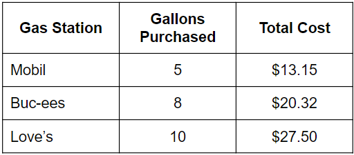 Frank purchased gas from 3 different gas stations. Use the chart below to figure out which gas station had the cheapest gas per gallon.