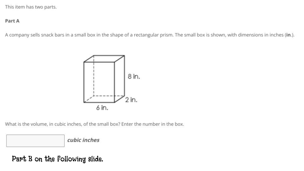 A company sells snack bars in a small box in the shape of a rectangular prism. The small box is shown with the dimensions in inches (in.) What is the volume, in cubic inches, of the small box?