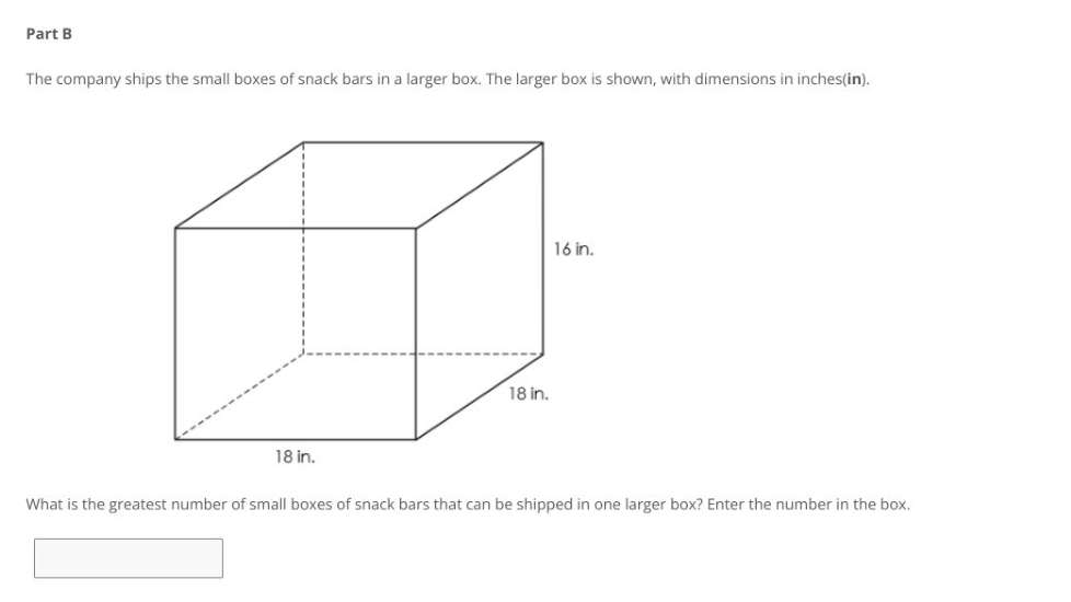 The company ships the small boxes of snack bars in a larger box. The larger box is shown, with dimensions in inches (in).What is the greatest number of small boxes of snack bars that can be shipped in one larger box?