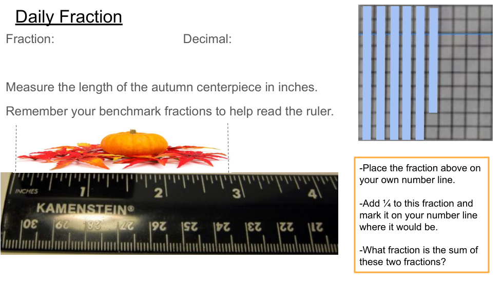 Measure the length of the autumn centerpiece in inches.Remember your benchmark fractions to help read the ruler.What is the measurement as a fraction?