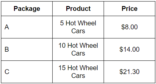 Jerry loves Hot Wheel cars. The store sells them in various packages as shown in the table below.