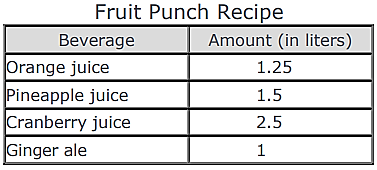 Alex made fruit punch for a party. The recipe is shown in the table.