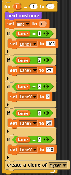 "i" goes from 1 to 5, creating 5 clones all lined up at x-position 240