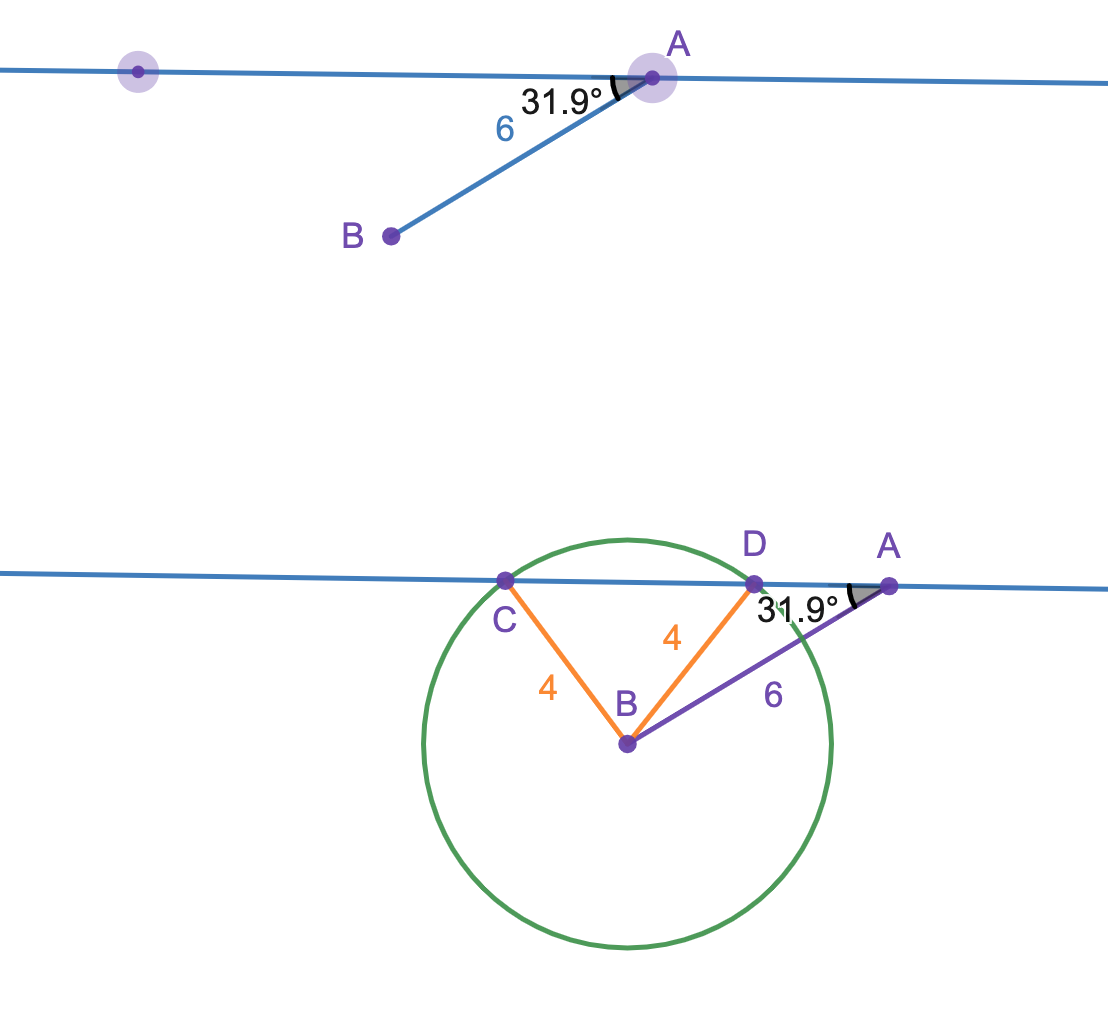 I know the second side i want is 4, so to construct my 31.9°, 6,4 triangle, I draw a circle of radius four around my point B. How many times does that circle touch my line?