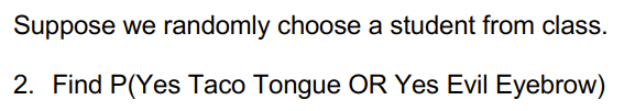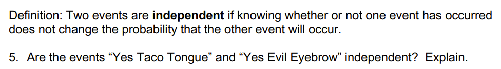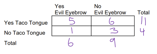 You may be wondering what the data would look like if Evil Eyebrow and Taco Tongue WERE independent. The next few questions will lead you through completing this table.