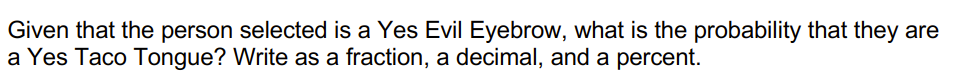 You would read this notation as "The Probability of a student being 'Yes Taco Tongue' GIVEN that they are 'Yes Evil Eyebrow'"