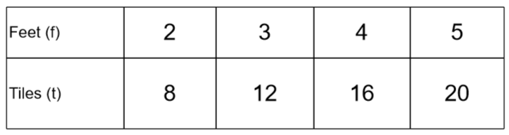 Brody is laying new tile flooring in his hallway. For every 2 feet in the hallway, he places 8 tiles. There is a proportional relationship between the length of the hallway Brody covers, f, and the number of tiles he needs, t.