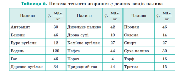Питома теплота згоряння палива показує, скільки енергії буде виділятися при спалюванні одного кілограма палива і є постійною величиною. Такі величини визначають дослідним шляхом і заносять у таблиці.