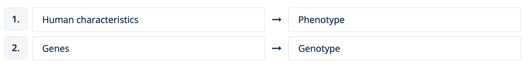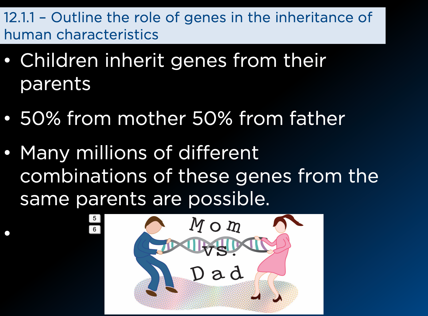 Children inherit __________ from their parents via the ________________________ , with 50% from the mother and 50% from the father (_______ chromosomes each = _______ chromosomes in total). _____________________ different combinations of these genes from the same parents are possible.