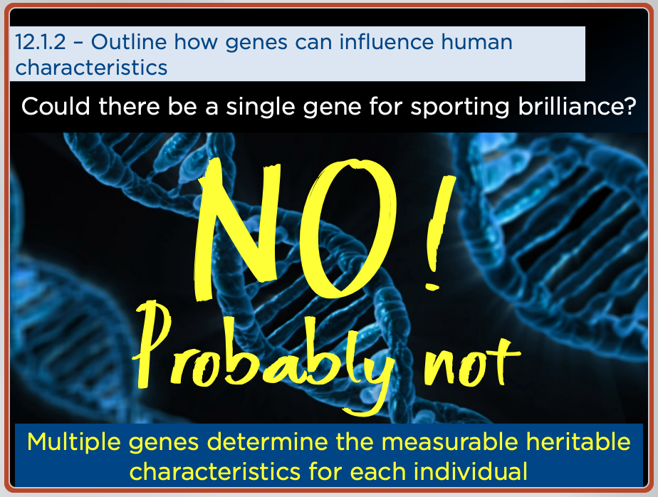 Multiple genes determine measurable characteristics, so it is ________ a single genetic element is associated with athletic performance.