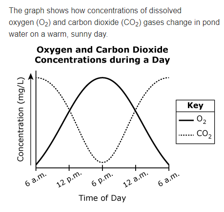 The graph shows how concentrations of dissolved oxygen (O2) and carbon dioxide (CO2) gases change in pond water on a warm, sunny day