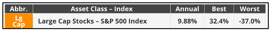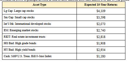 We’ve used the annual returns of each asset class from the chart and the compound interest formula, Value = P(1+i)t , to calculate the expected returns on $1000 of principal invested in each of these different asset class indices over this 15 year period.