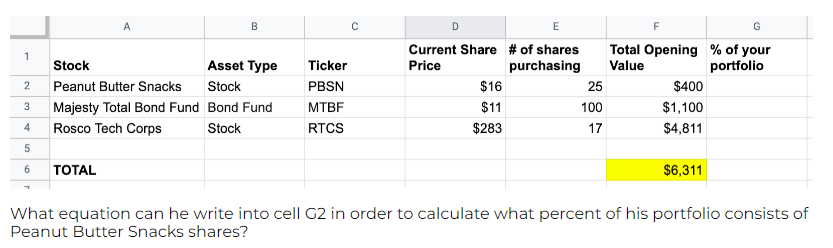 Colin is working to complete a spreadsheet to track his investment portfolio. Here’s where he’s gotten so far: