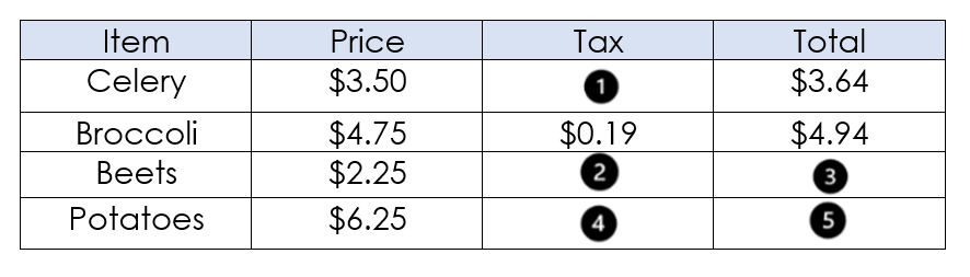 1) Celery tax price ($): _______ (just type in the number! No dollar sign!)