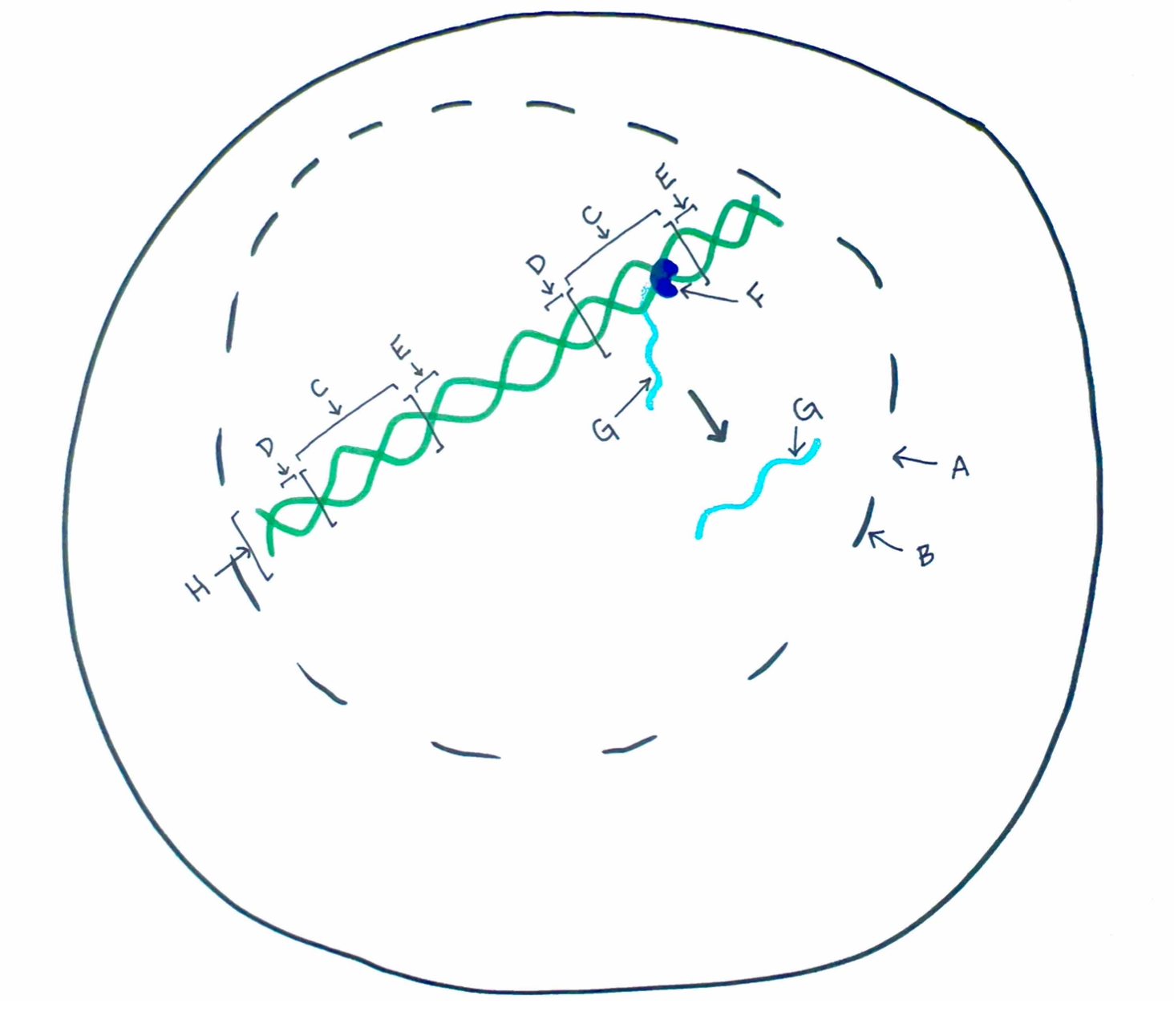 RNA Polymerase | arrow_right_alt | H (this is pointing to the whole green molecule) |