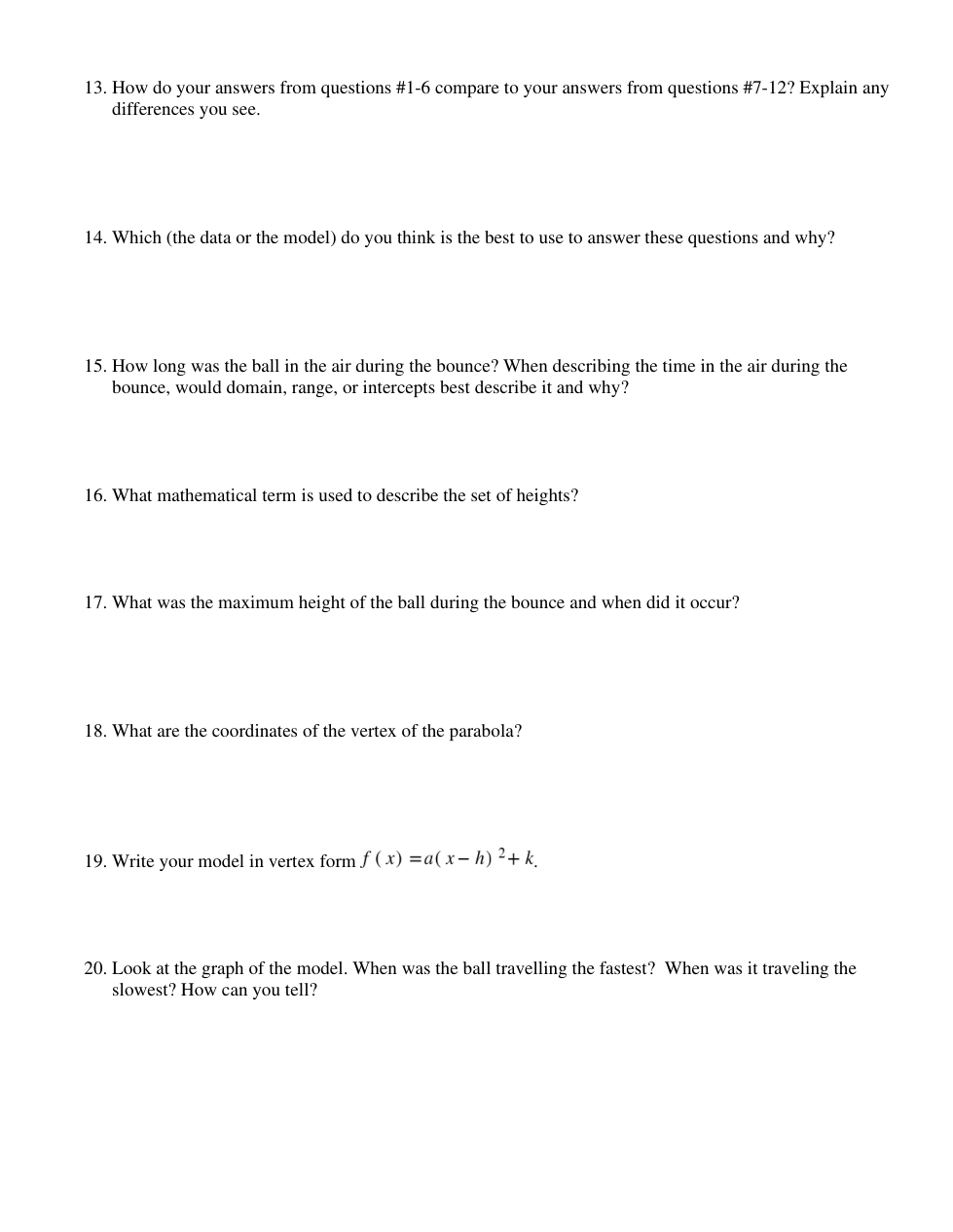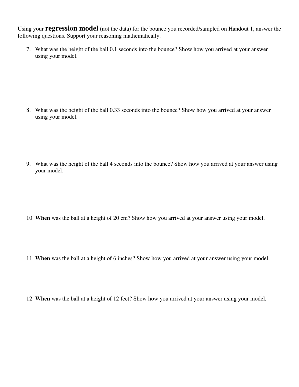 Using your equation from question 5 above, What was the height of the ball 0.1 seconds into the bounce? (Hint: Graph your equation from #5 here and plug 0.1 in for x in the equation)