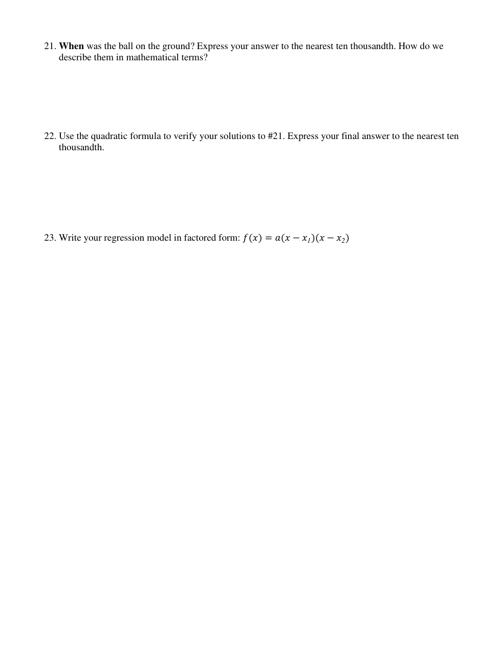 Graph your quadratic equation to verify your solutions to #28. What time does the equation show the ball back on the ground?