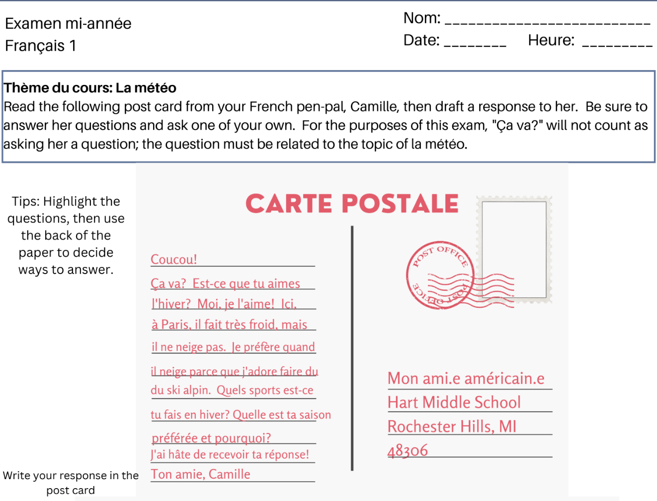 Lisez la carte postale de ton amie et répondez à elle. N'oublie pas de répondez à ses questions et posez-en une à elle aussi!