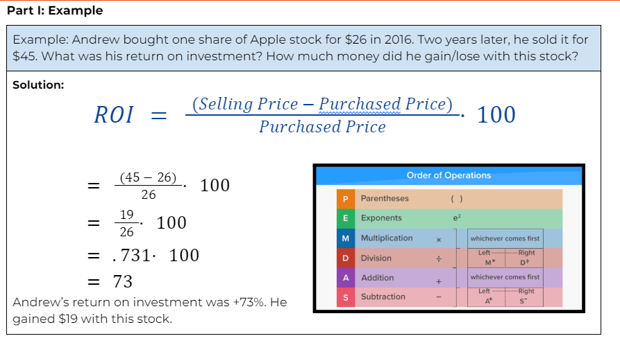 Return on Investment (ROI), also called percent growth, is a percentage that tells you the relationship between how much you spent on an investment and how much you get back from that investment. Calculating these percentages is helpful in seeing whether or not your investment is worth it! In this activity, you will practice calculating ROIs on investment options by practicing order of operations and interpreting percentages.