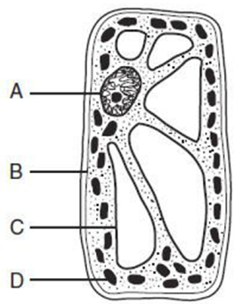 Look at Figure 1-2. Which structure stores materials, such as water, salts, proteins, and carbohydrates?