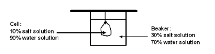 Osmosis occurs when there is a different concentration of solute molecules on each side of the membrane. The drawing below shows a beaker containing a 30% salt solution and a suspended cell containing a 10% salt solution. What statement best describes the cell after 20 minutes?