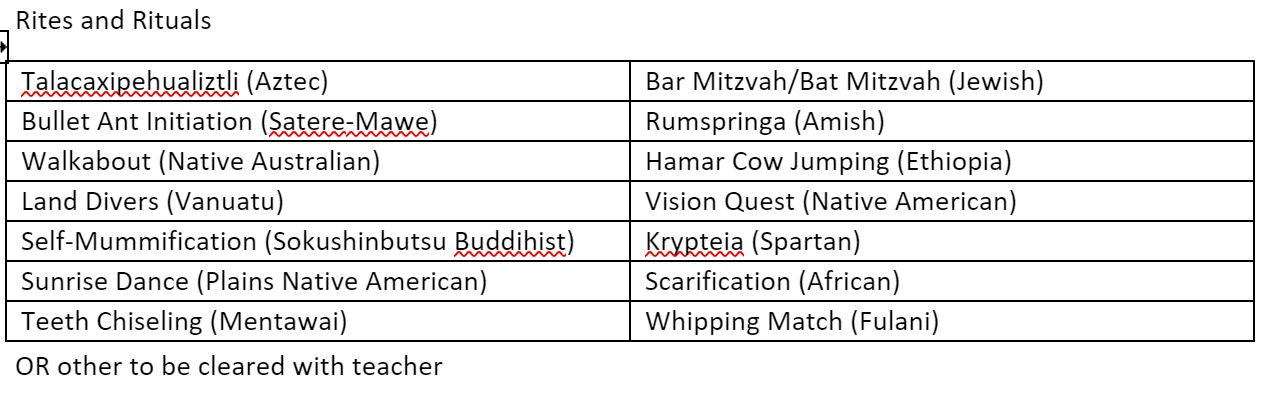 Choose a rite/Ritual from the list then answer the questions.