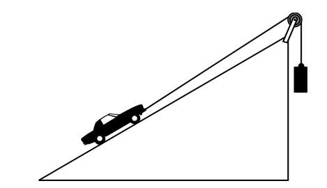 This diagram shows a ramp with a toy car at the bottom. A string is attached to the front of the car and the string goes over a pulley at the top of the ramp. A weight is attached to the other end of the string, and the car is pulled up the ramp. What is the relationship between the force of gravity on the weight and the force of tension on the weight?