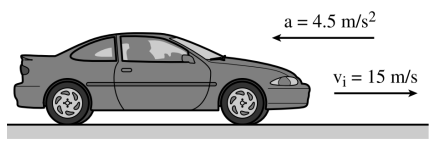 The illustration shows a car slowing down. The car was initially traveling at 15 m/s. The car slows with a negative acceleration of 4.5 m/s2 . How long does it take the car to slow to a final velocity of 4.0 m/s?