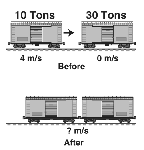 When these two freight cars of different mass collide and couple, what will be their resultant velocity?