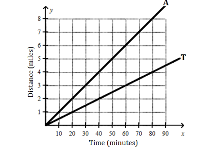 Albert (A) went running and Tanisha (T) walked for exercise each day after work. Their times and distances are shown in the graph below.