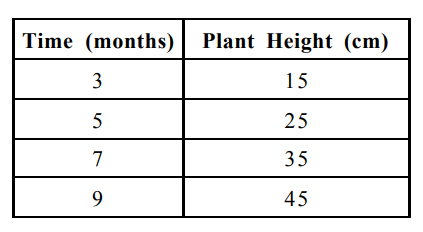 The table shows the height of a plant as it grows. Let y stand for the height of the plant in cm and let x stand for the time in months.