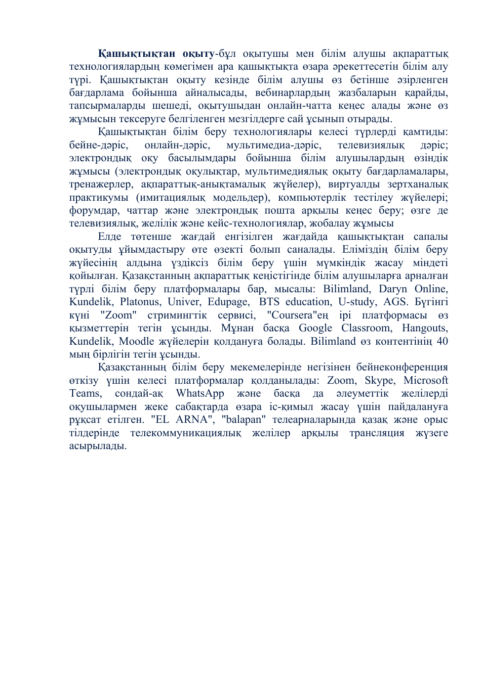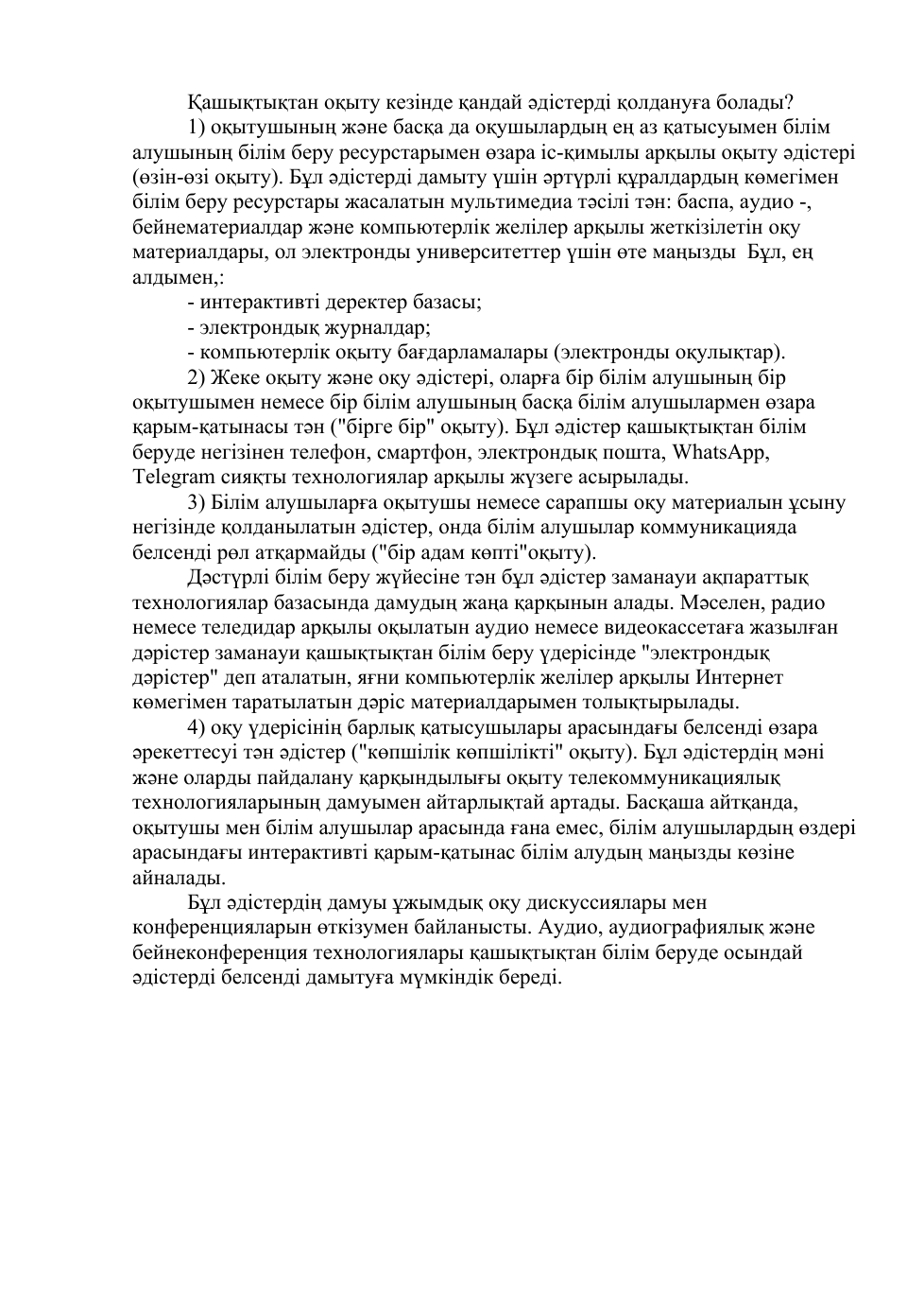 Қашықтықтан оқыту кезінде білім алушы мұғалімнің әзірленген бағдарлама бойынша айналысады, вебинарлардың жазбаларын қарайды,бір бірінен онлайн-чатта кеңес алады