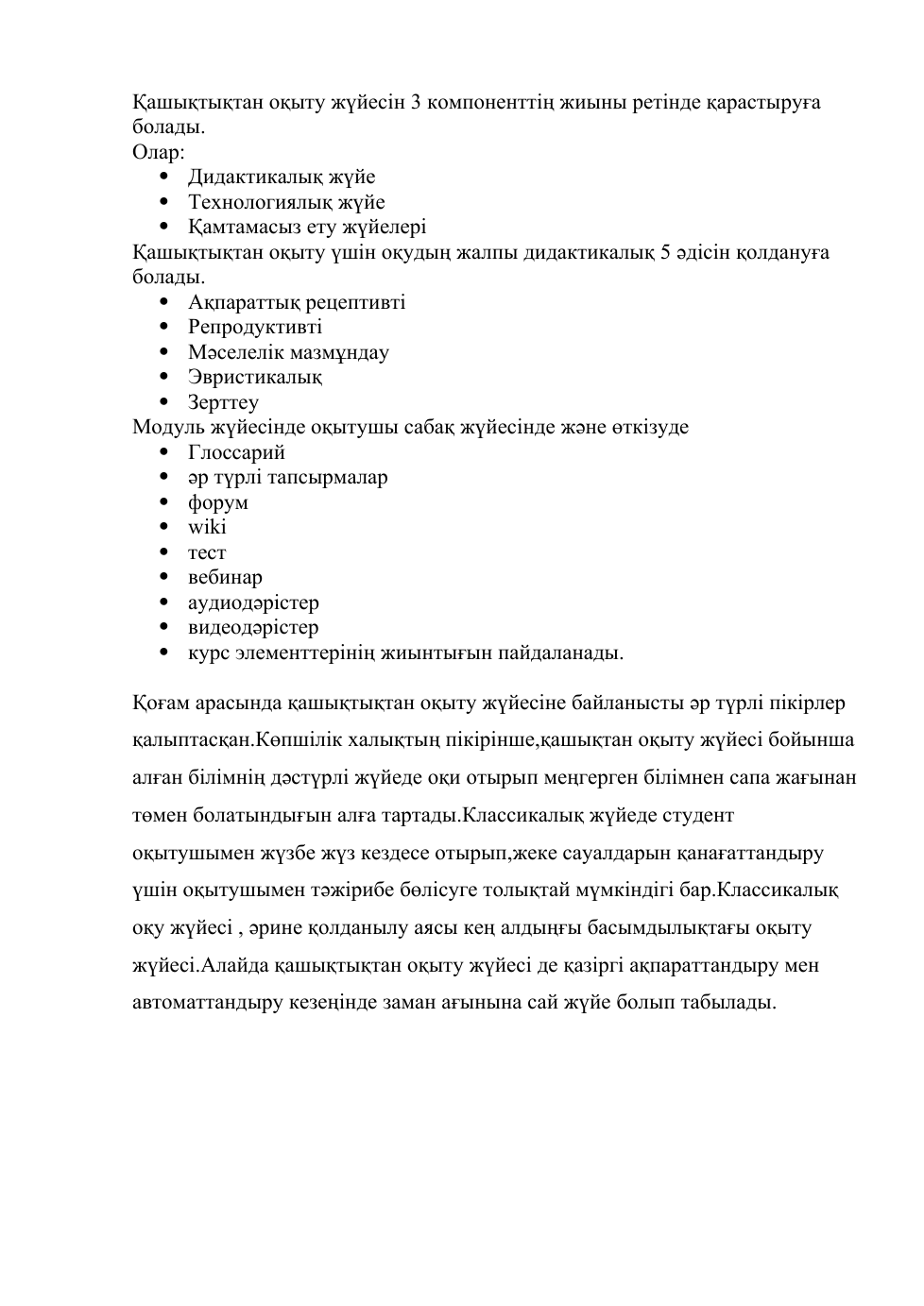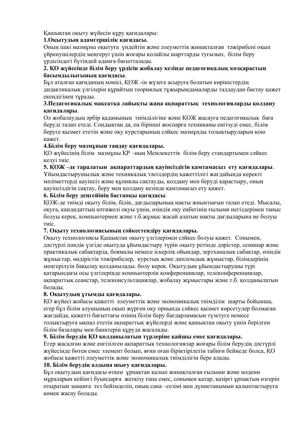 Оқытудың ұйымдастырушы түрі қатарындағы осы үлгілерінде компьютерлік конференциялар, телеконференциялар, ақпараттық сеанстар, телеконсультациялар, жобалау жұмыстары және т.б. қолданылатын болады. | ҚО жүйесінің білім мазмұны ҚР –ның Мемлекеттік білім беру стандартымен сәйкес келуі тиіс. | |