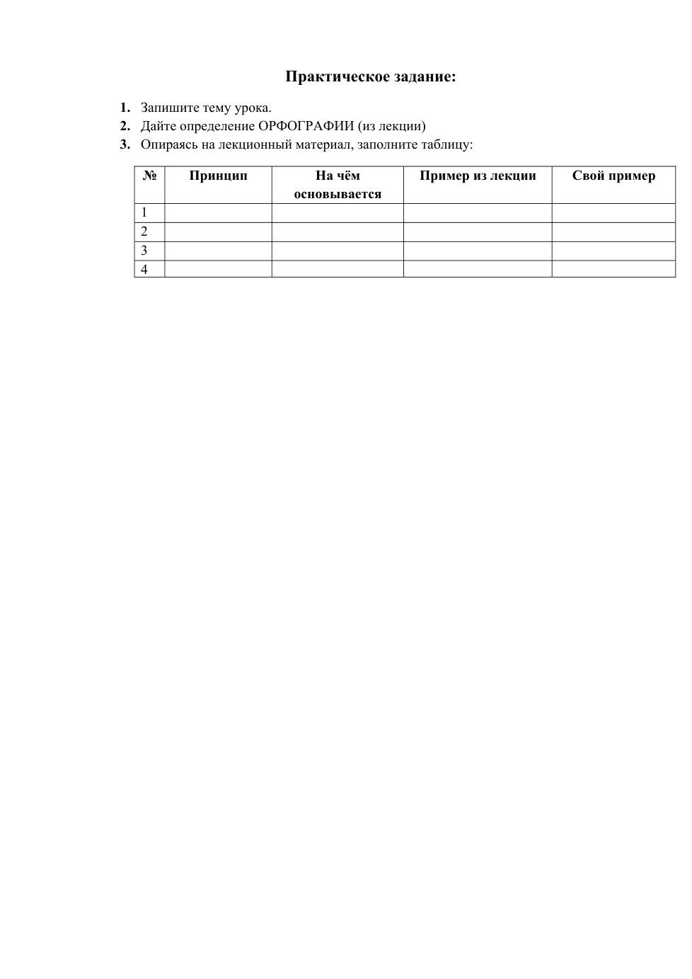 1. Основной принцип русской орфографии — морфологический (морфемный). Суть его: единообразно пишу морфемы. Этот принцип распространяется на любую значимую часть слова. Например, нужно единообразно обозначать на письме один и тот же корень во всех однокоренных словах, одну и ту же приставку, один и тот же суффикс. В корне -плод- пишут одни и те же буквы независимо от того, какие звуки произносят в слабых позициях: хотя произносят без ударения — пл[/\]ды, на конце слова — пло[т].