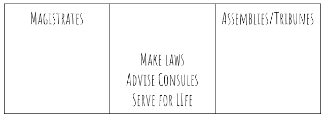 patricians | arrow_right_alt | Rome's government was divided into this many parts |