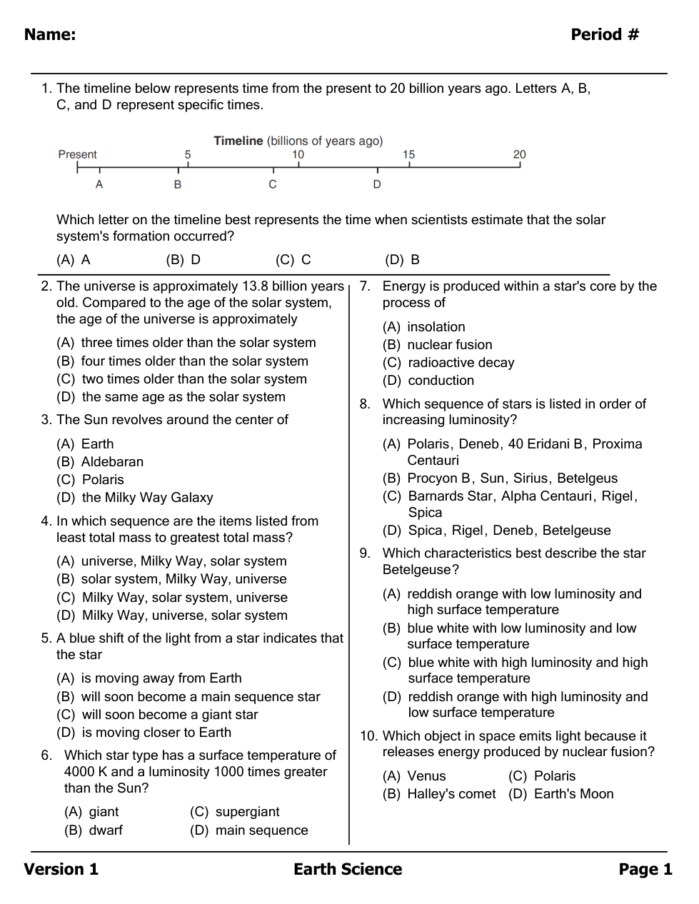 The timeline below represents time from the present to 20 billion years ago. Letters A, B, C, and D represent specific times. Which letter on the timeline best represents the time when scientists estimate that the solar system's formation occurred?