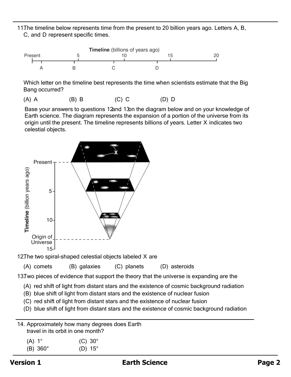 Base your answers to questions 12 and 13 on the diagram below and on your knowledge of Earth science. The diagram represents the expansion of a portion of the universe from its origin until the present. The timeline represents billions of years. Letter X indicates two celestial objects.