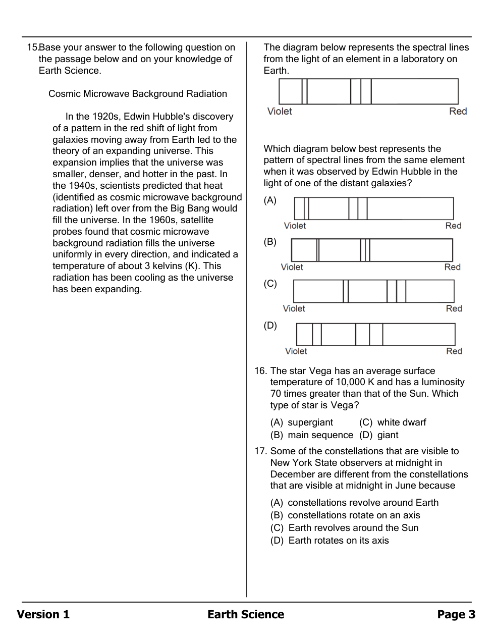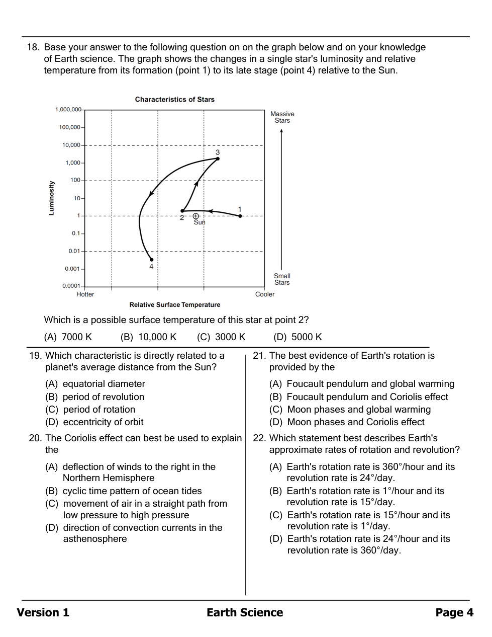 Question 18: Base your answer to the following question on the graph below and on your knowledge of Earth science. The graph shows the changes in a single star's luminosity and relative temperature from its formation (point 1) to its late stage (point 4) relative to the Sun.